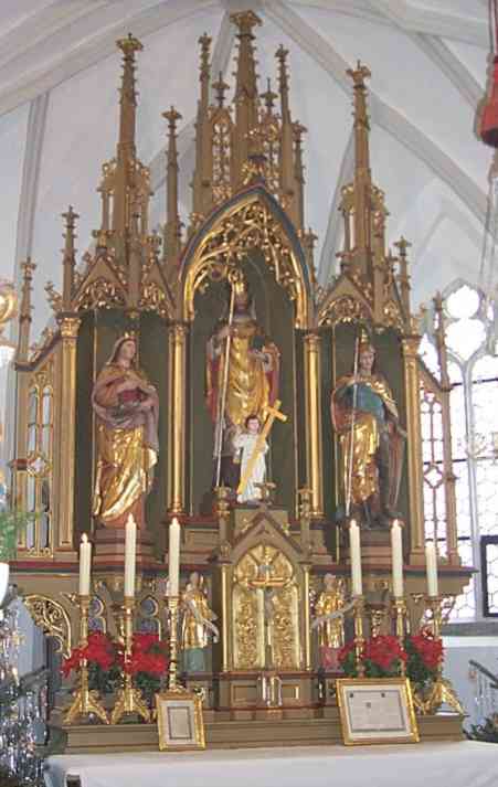 Der Hochaltar aus dem Jahr 1885 ist ein Geschenk von Georg und Elisabeth Wittmann aus Thonstetten. Er stellt die Namenspatrone der Stifter (Georg und Elisabeth) sowie den hl. Valentin vor. Seit dem Jahr 1403 wird der hl. Valentin als Kirchenpatron erwähnt. Eine rustikale Statue aus dem 16. Jahrhundert am hinteren Chorbogen und das Deckengemälde, das jüngeren Datums ist, zeigen den Heiligen. Er wird gerne als Bischof mit einem Kranken zu seinen Füßen oder mit einem Schwert, das auf sein Martyrium hinweist, abgebildet. Aus der Überlieferung wissen wir nicht allzuviel über sein Leben. Als römischer Wanderbischof wirkte er bei der Christianisierung in Passau mit. Der hl. Korbinian war ein besonderer Verehrer des hl. Valentins. Durch ihn kam dessen Patrozinium nach Freising.